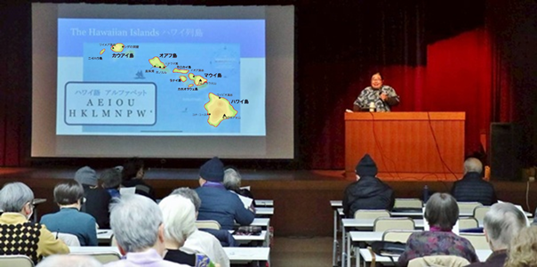 {「アロハ」でにこやかに挨拶をした後、たくさんのスライドを見せて頂きました。日本語を巧みに操り、ハワイについて思うところを余すところなくお話してくださりました。Thank you very much!}